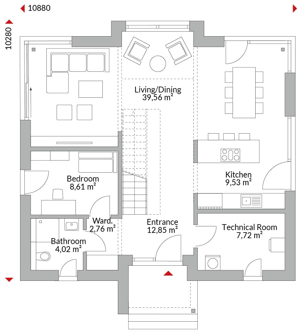 One-and-a-half-storey house with covered entrance over elevated front door. Gable windows on both sides upstairs. Knee wall windows upstairs. Raised ground floor with taller windows in the dining area, designed as open-plan kitchen connected to the adjacent living/dining area with corner glazing in the dining area and sliding doors to the terrace and garden. Separate study suitable for guests or use as a home office. Three bedrooms, one with en-suite bathroom and walk-in wardrobe area. Additional shower room and guest WC. Technical room, entrance hall and hallway. Gable roof with wide eaves (60 cm), 30° pitch. Knee wall height: 1.75 m.