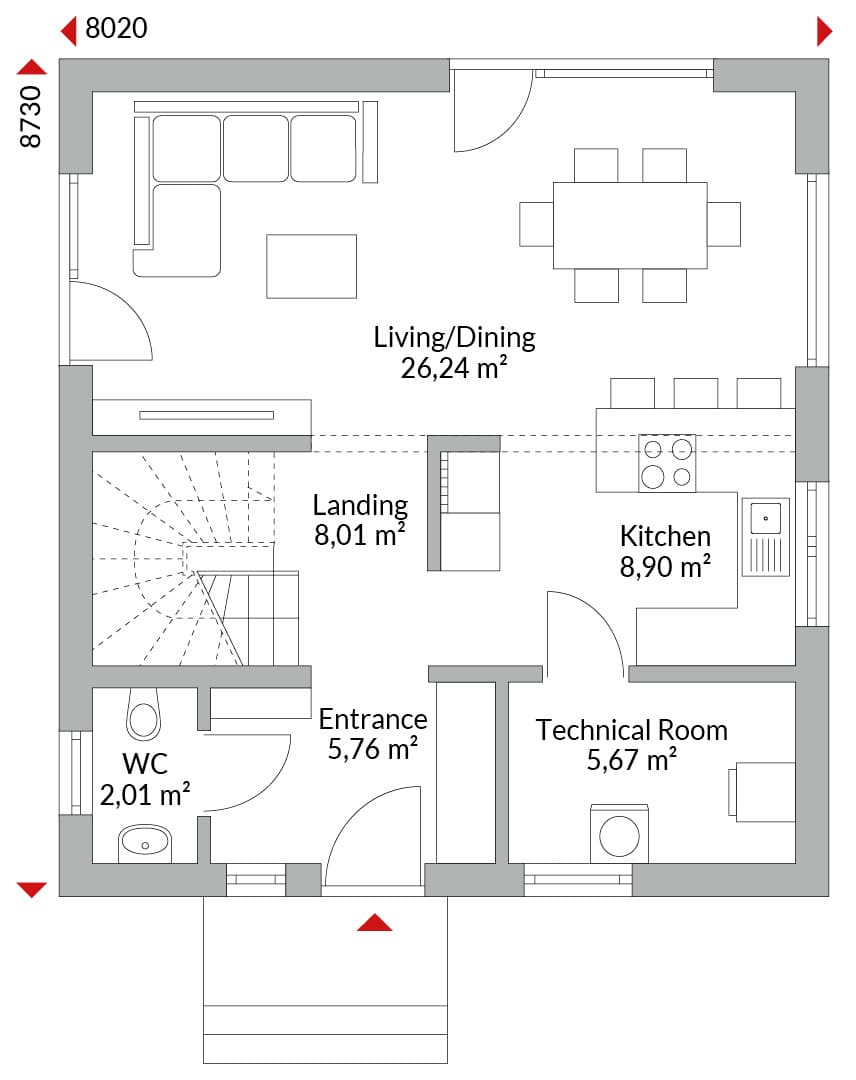 One-and-a-half-storey house with four bedrooms, open-plan kitchen, bathroom, guest WC, entrance hall, hallway and technical room. Gable roof with 40° pitch. Knee wall height: 1.00 m.