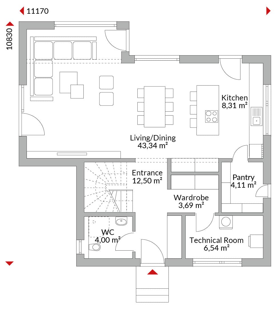 One-and-a-half-storey house with four bedrooms, open-plan kitchen, pantry, bathroom, guest WC, technical room and entrance hall. Gable roof with 30° pitch. Knee wall height: 1.50 m.