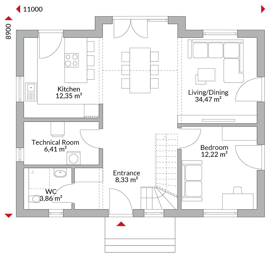 One-and-a-half-storey house with five bedrooms, walk-in wardrobe area, open-plan kitchen, two bathrooms, guest WC, entrance hall, hallway and technical room. Gable roof with 30° pitch. Knee wall height: 1.50 m.