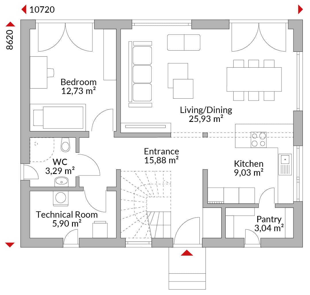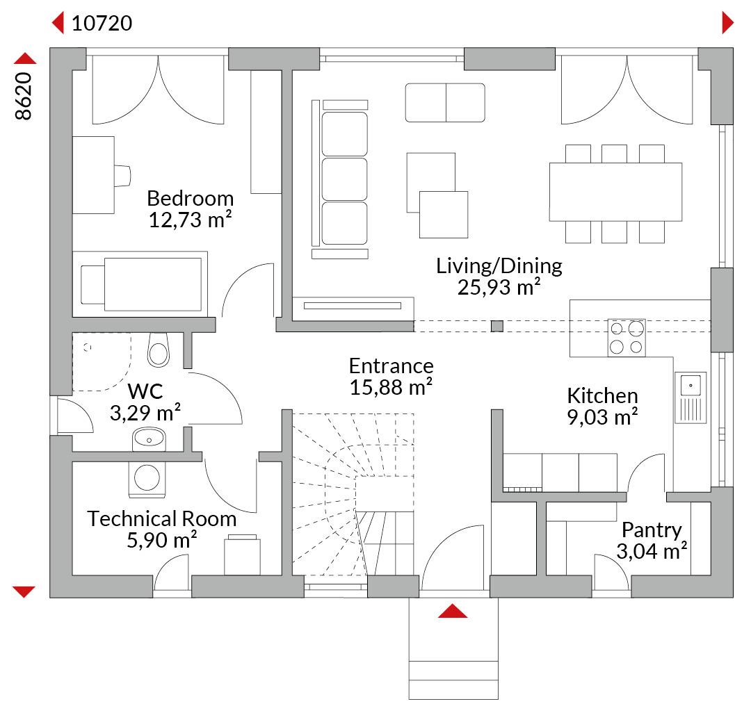 One-and-a-half-storey house with two transverse gables, five bedrooms, walk-in wardrobe area, open-plan kitchen, pantry, bathroom, guest WC, technical room and entrance hall. Gable roof with 40° pitch (transverse gables 35°). Knee wall height: 1.00 m.