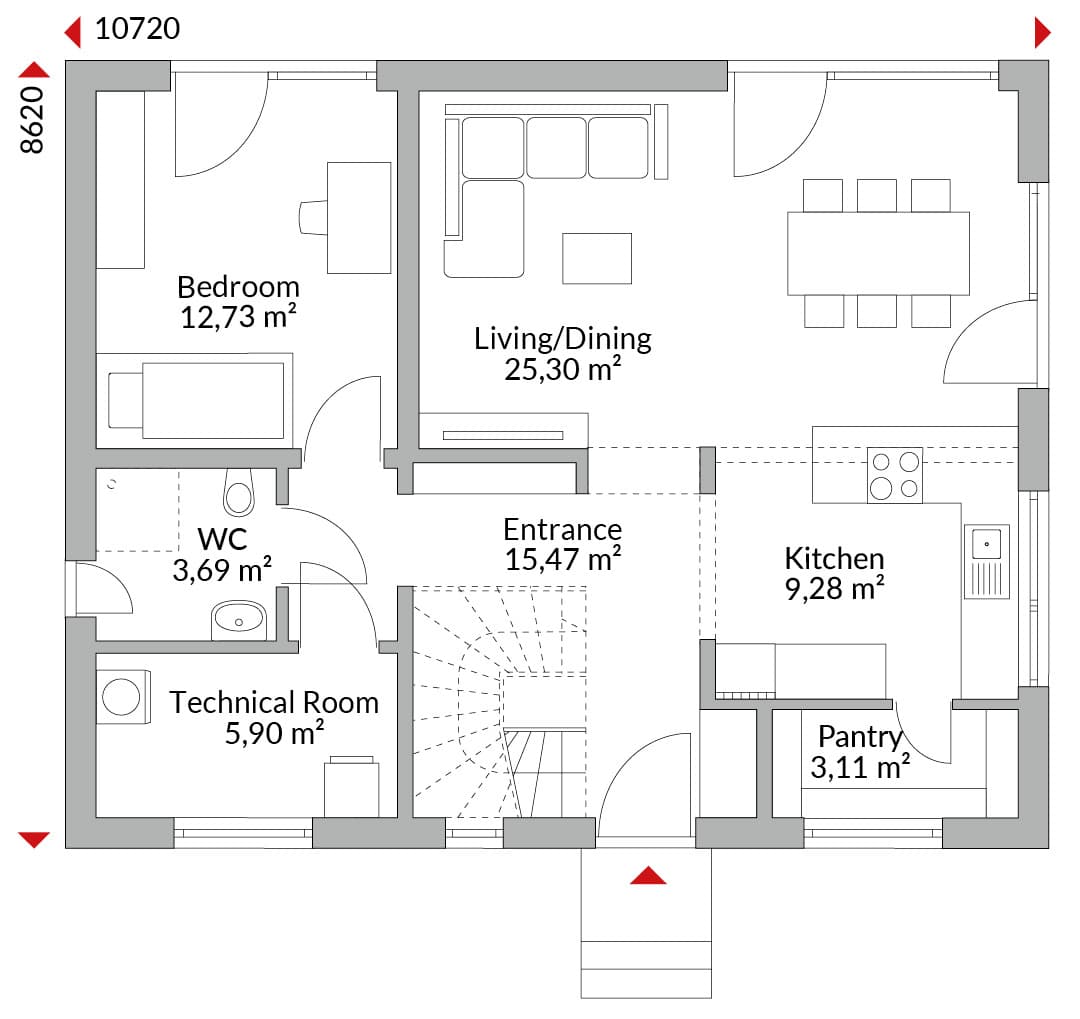 One-and-a-half-storey house with six bedrooms, open-plan kitchen, pantry, bathroom, guest WC, entrance hall, hallway and technical room. Gable roof with 40° pitch. Knee wall height: 0.75 m.