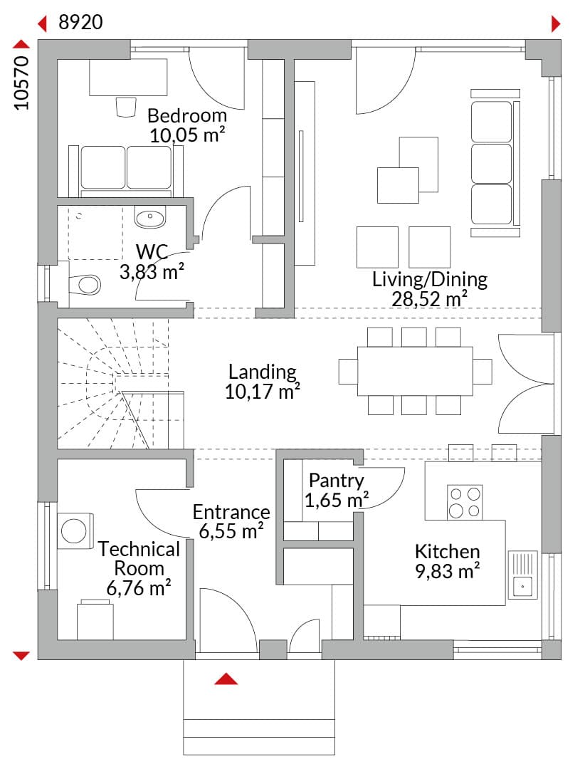 One-and-a-half-storey house with five bedrooms, walk-in wardrobe area, open-plan kitchen, pantry, bathroom, guest WC, technical room, entrance hall and hallway. Gable roof with 40° pitch. Knee wall height: 0.75 m.
