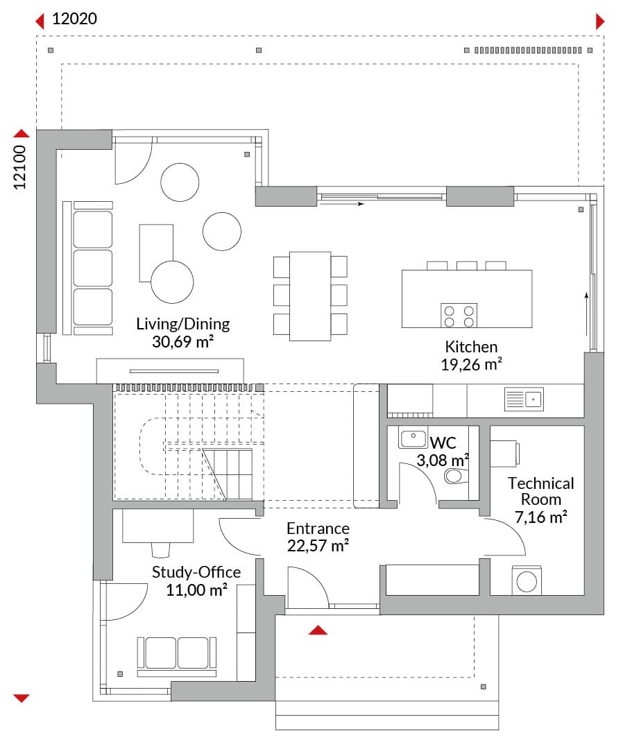 One-and-a-half-storey house with entrance canopy over the higher front door; entrance with staircase; open-plan living/dining area with sliding doors to the terrace; kitchen with cooking island; study/office; technical room; WC; master bedroom with walk-in wardrobe area and en-suite with shower and double sinks; two single bedrooms; family bathroom; gable roof with 35° roof pitch; knee wall height 1.80 metres.