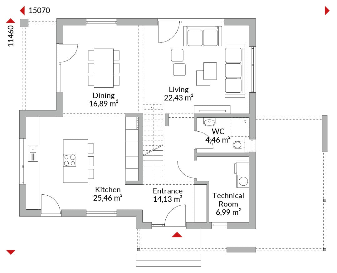 One-and-a-half-storey house with four bedrooms, walk-in wardrobe area, open-plan kitchen, bathroom, guest WC, technical room, entrance hall and integrated carport with entrance canopy and terrace roof. Offset mono-pitch roofs with 25° pitch. Knee wall heights: 1.75 m and 1.424 m. Carport with flat roof.