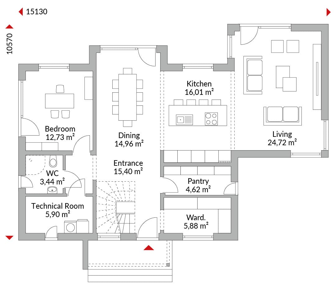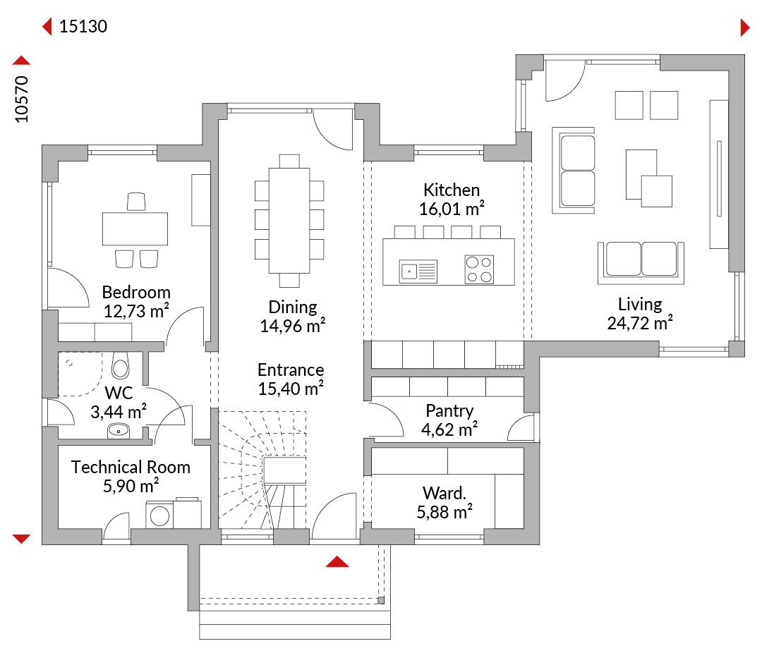 One-and-a-half-storey house with five bedrooms and a study, flat-roof gable, extension, flat-roof entrance canopy, large coat area, open-plan kitchen, pantry, bathroom, guest WC, technical room and entrance hall. Gable roof with 25° pitch (flat-roof gable 0°). Knee wall height: 1.75 m.