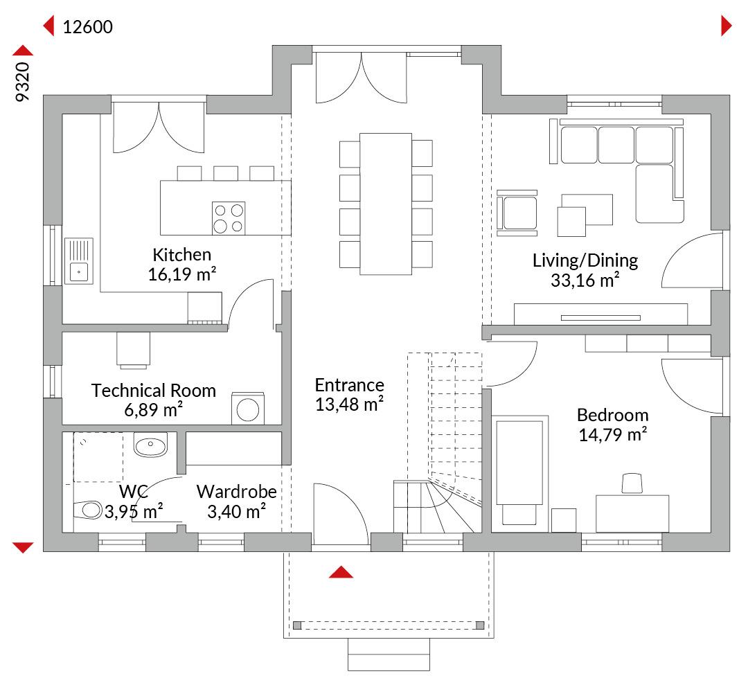 One-and-a-half-storey house with six bedrooms, open-plan kitchen, bathroom, guest WC, technical room, entrance hall, coat area and additional transverse gable. Gable roof with 40° pitch. Knee wall height: 1.00 m. Includes transverse gable, balcony and entrance canopy.