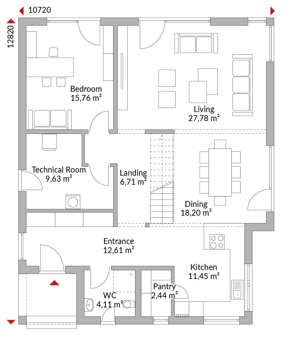 One-and-a-half-storey house with seven bedrooms, walk-in wardrobe area, gallery, open-plan kitchen, pantry, bathroom, guest WC, entrance hall, hallway and technical room. Gable roof with 30° pitch. Knee wall height: 1.25 m. Includes covered entrance.