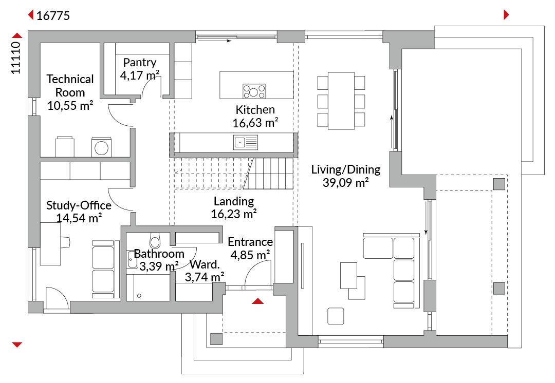One-and-a-half-storey house with an entrance canopy on the higher front door; three bedrooms on the upper floor; master en-suite bedroom with walk-in wardrobe, double sinks, and free-standing bathtub and shower; second bathroom on the upper floor with shower; two storage rooms; floor-to-ceiling glazing on the gable windows at the garden side; separate studio on the ground floor. The higher ground floor with raised floor-to-ceiling glazing is designed as an open-plan kitchen/living/dining room with sliding doors to the terrace; pantry; technical room; hallway with cloakroom; guest WC with shower; knee wall height 150cms; gable roof with wide eaves of 60cms on the garden-side gable; 38° roof pitch.