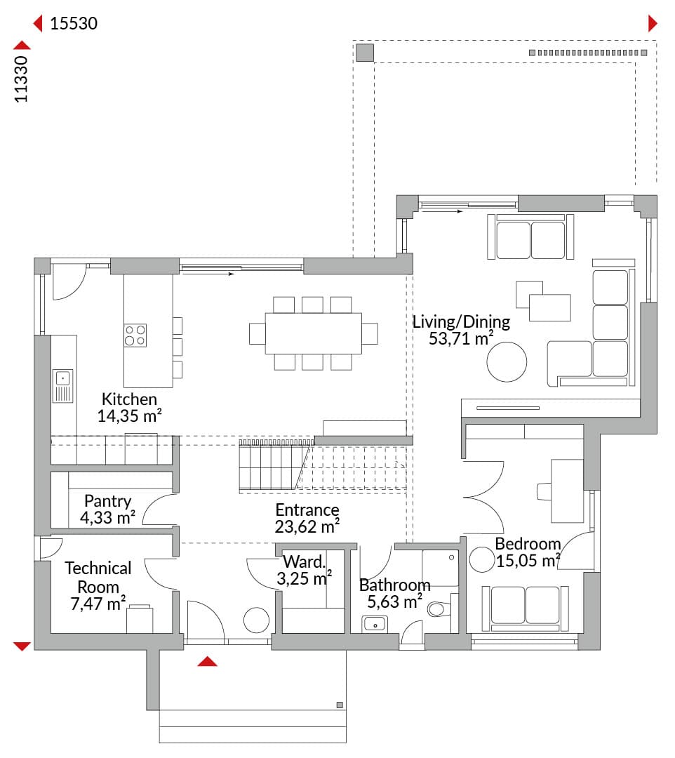 One-and-a-half-storey house with an entrance roof over the higher front door; three bedrooms on the upper floor; master bedroom with rectangular bay window and walk-in dressing room with en-suite, including double sink, free-standing bathtub and shower; second bathroom on the upper floor with bathtub, shower and toilet; hallway; floor-to-ceiling glazing including bay window; separate room on the ground floor. The higher ground floor with raised floor-to-ceiling glazing is designed as an open-plan kitchen/living/dining area with sliding doors to the covered terrace; pantry; technical room; hallway with open void ceiling; cloakroom; guest WC with shower; knee wall height 160cms; gable roof with wide eaves of 60cms; 35° roof pitch.