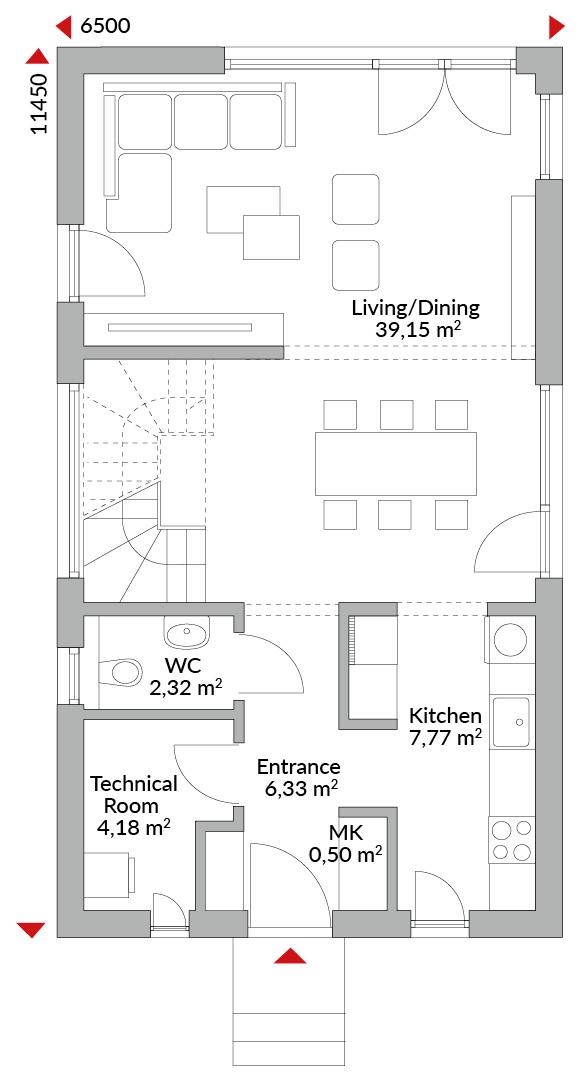 Two-storey house with three bedrooms, open-plan kitchen, spacious living/dining area with outdoor access, guest WC, technical room, and entrance hall. The upper floor features a master bedroom with en-suite bathroom and walk-in wardrobe area, three single bedrooms and a family bathroom. Gable roof with 25° pitch.