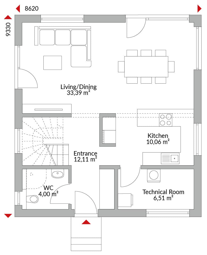 Two-storey house with three bedrooms,, entrance hall with staircase and wardrobe, WC, kitchen, pantry, technical room, open-plan living/dining area with outdoor access, master bedroom with en-suite and walk-in wardrobe, two single bedrooms, family bathroom.