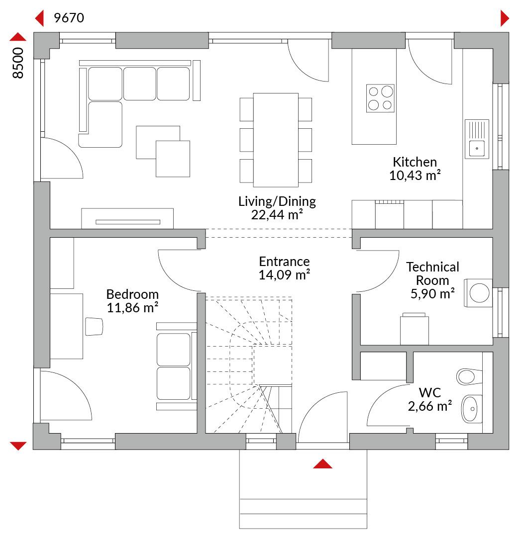 Two-storey villa with four bedrooms, open-plan kitchen, spacious living/dining area, bathroom, guest WC, technical room and entrance hall. Hipped roof with 22° pitch.