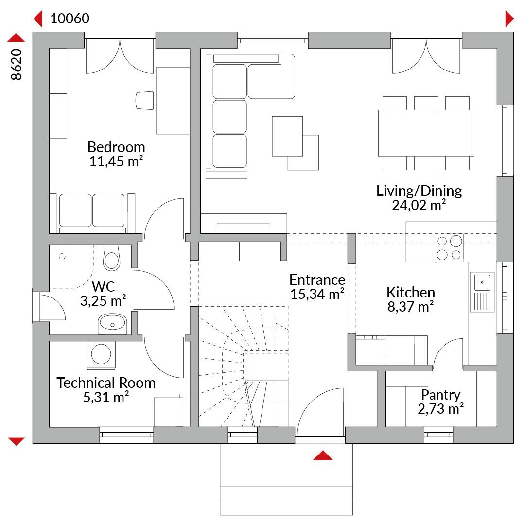 Two-storey villa with four bedrooms, open-plan kitchen, pantry, spacious living/dining area, guest WC, technical room and entrance hall. Bathroom and walk-in wardrobe area on the upper floor. Hipped roof with 22° pitch.