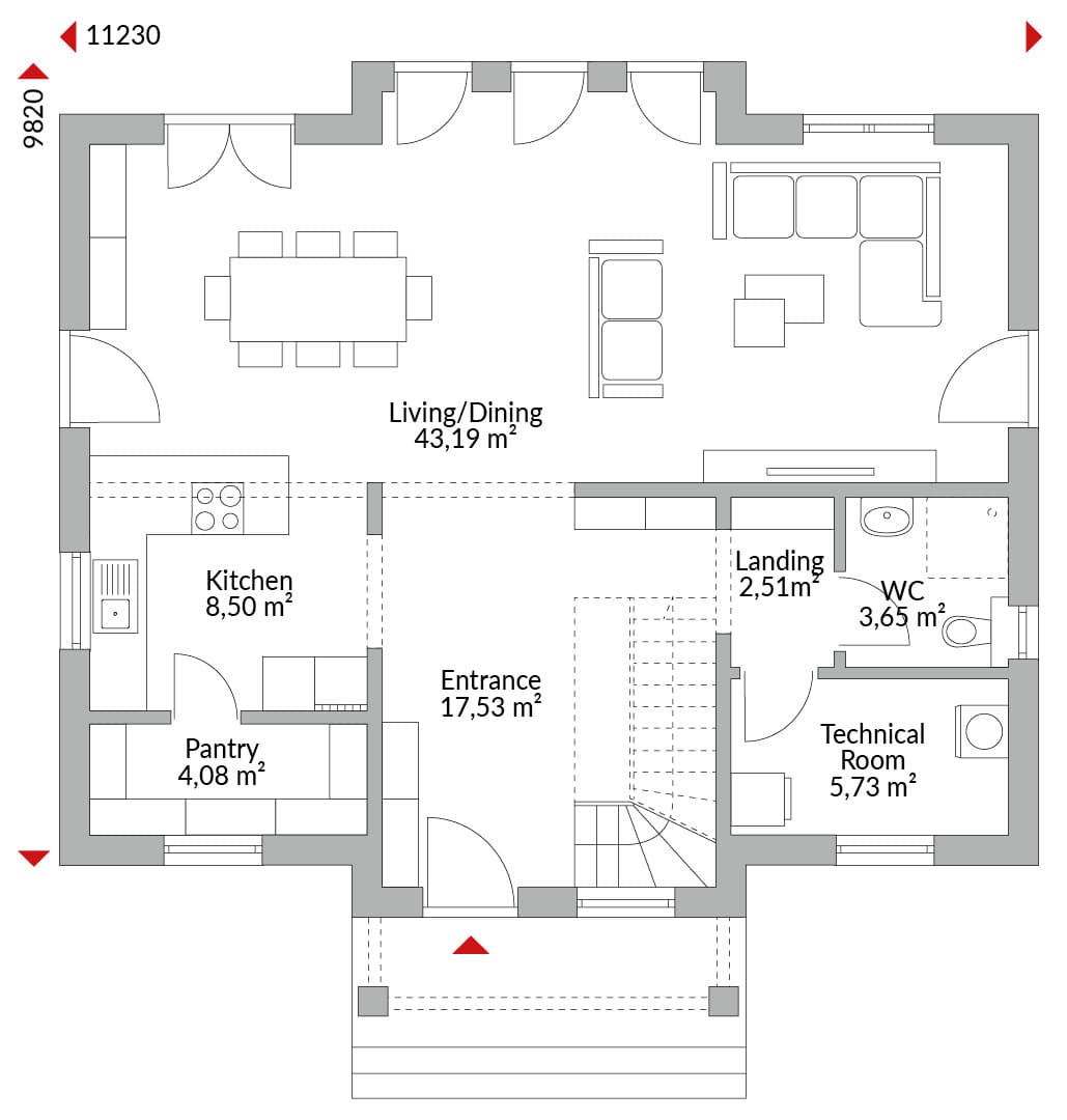 Two-storey villa with three bedrooms, open-plan kitchen, pantry, spacious living/dining area, guest WC, technical room and entrance hall. Bathroom and large walk-in wardrobe area plus storage room on the upper floor. Hipped roof with 22° pitch.