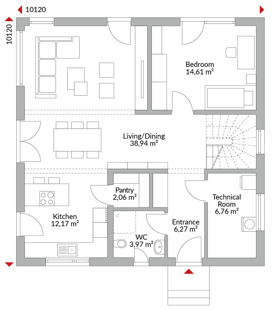 Two-storey villa with four bedrooms, open-plan kitchen, pantry, spacious living/dining area, guest WC, technical room and entrance hall. Bathroom and two walk-in wardrobe areas on the upper floor. Hipped roof with 22° pitch.