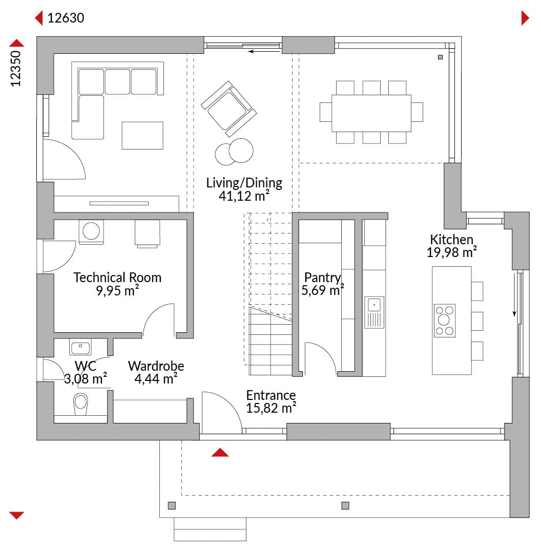 Two-storey house with a wide entrance roof on the higher front door and a straight corner bay window; three bedrooms on the upper floor; open void ceiling; spacious hallway; master bedroom with en-suite shower room and dressing room; second bathroom with freestanding bath and shower; the raised ground floor with corner glazing in the dining area and higher windows is designed as an open-plan kitchen/living/dining area with sliding doors to the terrace; separate pantry; guest WC; technical room and hallway; tent roof with wide eaves of 60cms; 22° roof pitch.