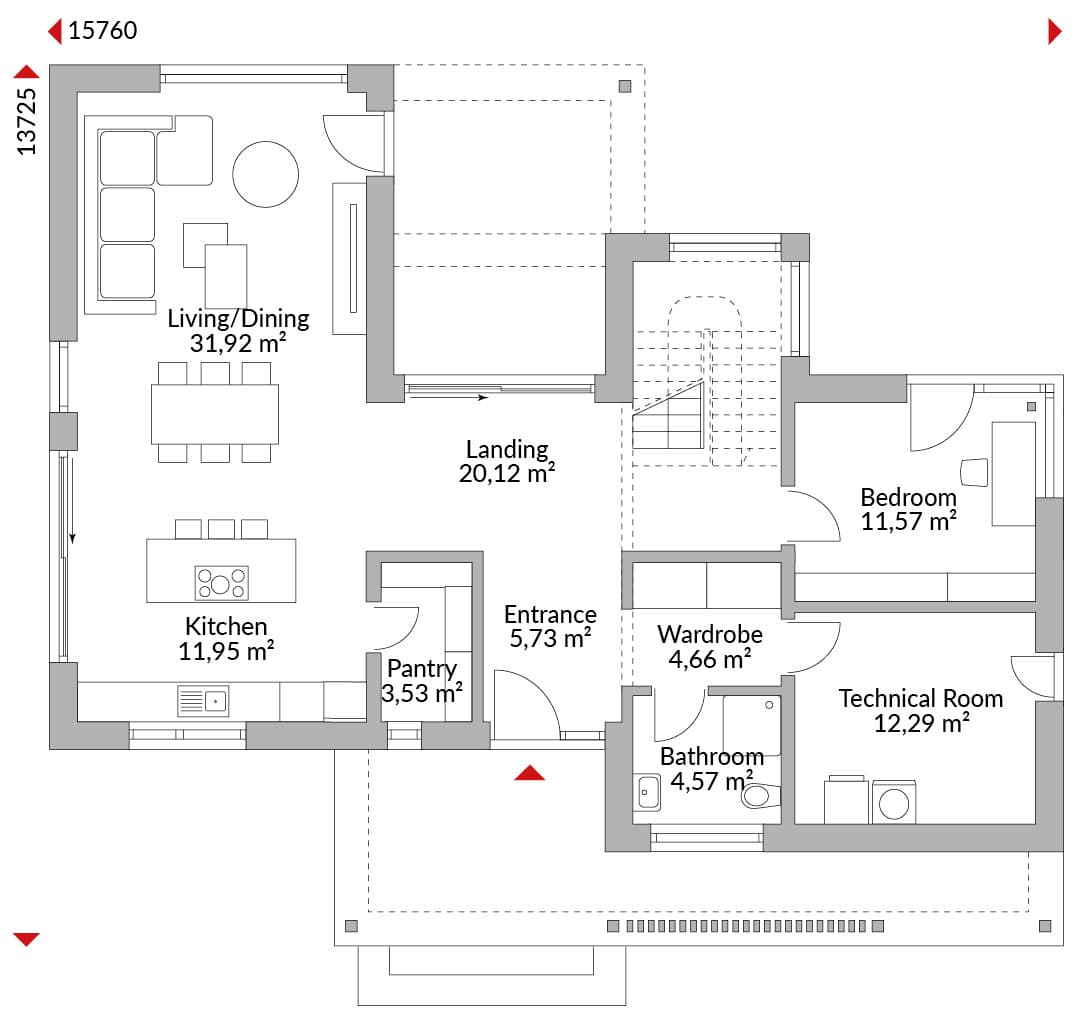Two-storey house with a wide entrance roof on the higher front door and a straight corner bay window; terrace partially covered by roof overhang; three bedrooms and hallway on the upper floor; master en-suite bedroom with free-standing bathtub, shower, double sink and separate dressing room; additional second shower room; the raised ground floor is designed with higher windows as an open-plan kitchen/living/dining area with sliding doors to the terrace; separate pantry; guest WC; technical room and hallway with cloakroom; gable roof without roof overhangs; 35° roof pitch.