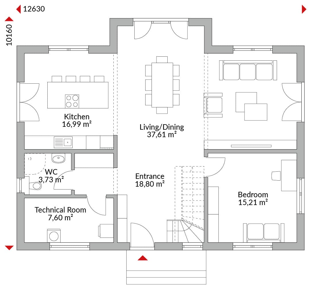 Two-storey house with five bedrooms, open-plan kitchen, spacious living/dining area, guest WC, technical room and entrance hall. Bathroom and walk-in wardrobe area on the upper floor. Hipped roof with 22° pitch.