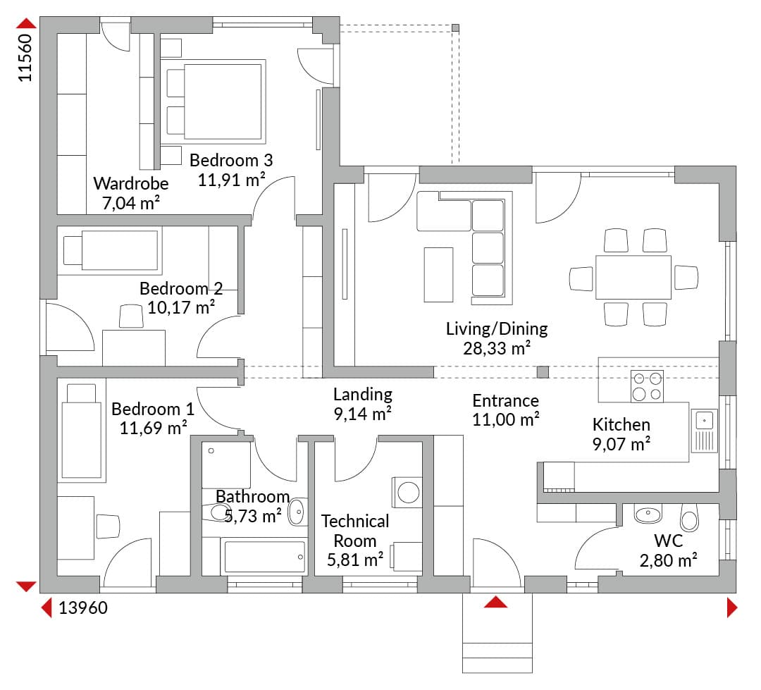 Three-bedroom bungalow, wardrobe, entrance hall, open-plan living/dining/kitchen area, bathroom with shower, technical room, WC, gabled roof with 22° roof pitch.