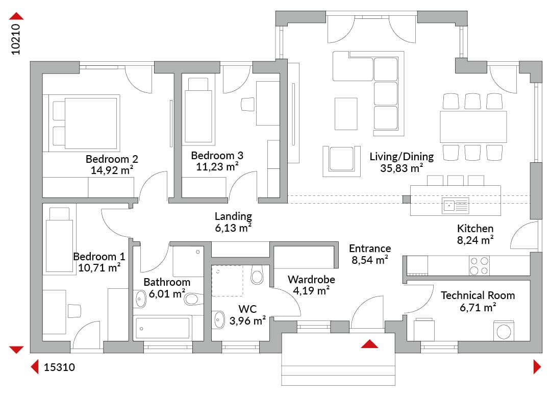 Three-bedroom bungalow with open-plan kitchen, bathroom, guest WC, technical room, hallway, cloakroom and entrance area. Gable roof with a 22° pitch.