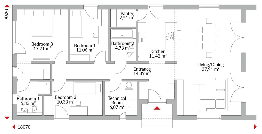 Three-bedroom bungalow, entrance and hall, technical room, open-plan living/dining area with outdoor access and adjoining kitchen, master bedroom with en-suite and walk-in wardrobe area, family bathroom, storage.