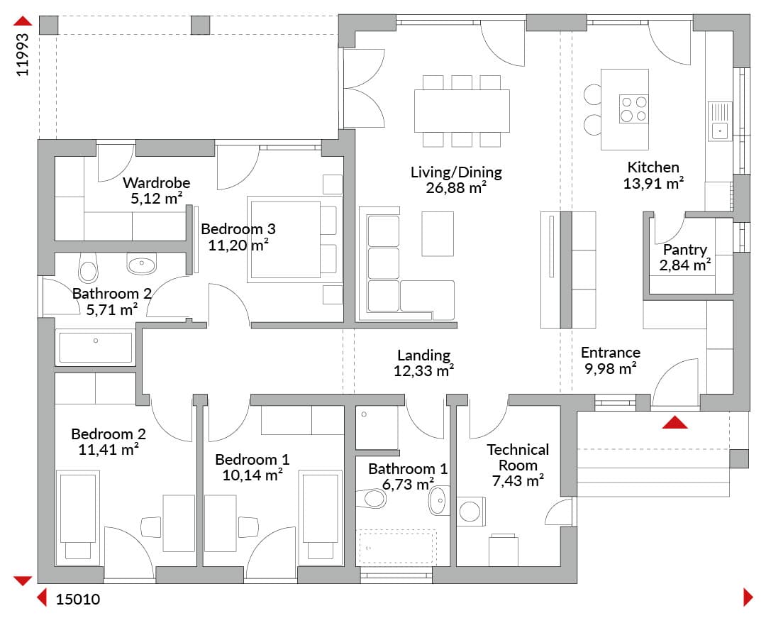 Three-bedroom bungalow, wardrobe, en-suite with bath, entrance hall, open-plan living/dining/kitchen area, pantry, bathroom with shower, technical room, gabled roof with 25° roof pitch.