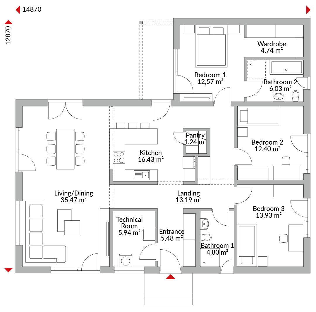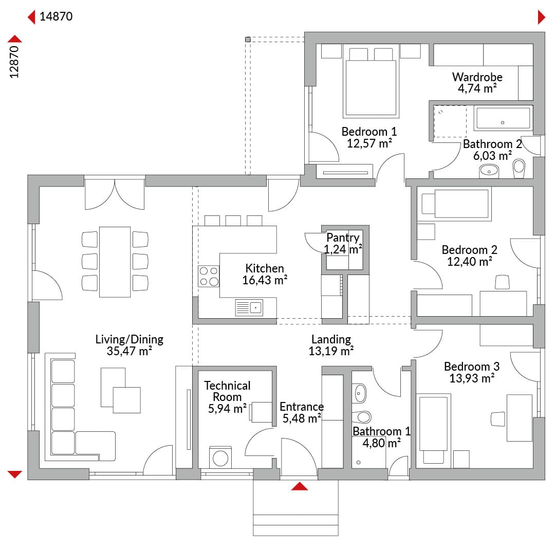 Three-bedroom bungalow, entrance hallway, technical room, open-plan living/dining area with adjoining kitchen and outdoor access, master bedroom with en-suite bath/shower room and walk-in wardrobe, two single bedrooms, family shower room, storage.