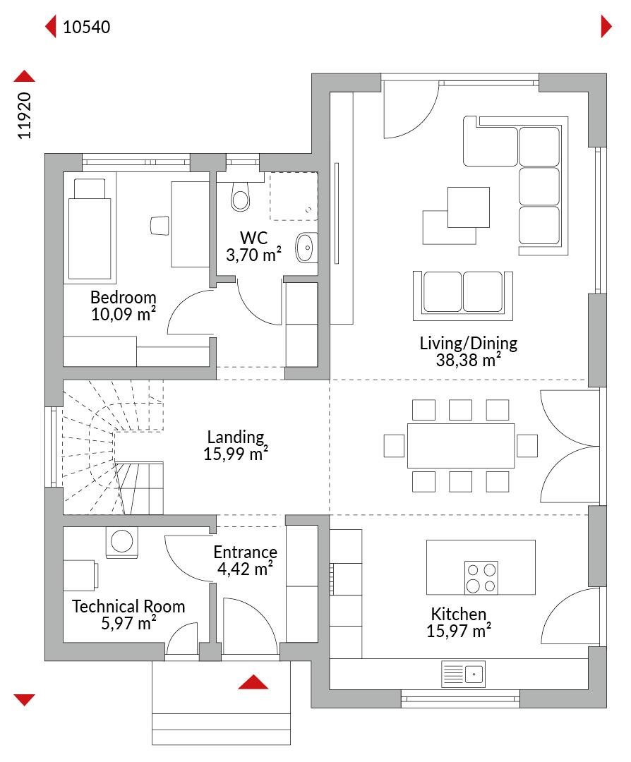 Two-bedroom bungalow with open-plan kitchen, pantry, bathroom, guest WC, entrance area and technical room. Dining area open to the roof. Mono-pitch roof with a 25° pitch.