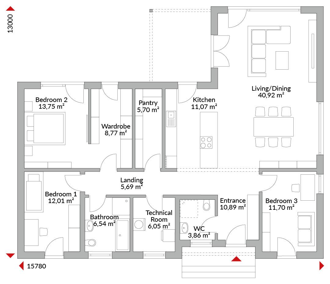 Three-bedroom L-shaped bungalow with walk-in wardrobe area, open-plan kitchen, pantry, bathroom, guest WC, technical room, entrance area and hallway. Integrated canopy over entrance and terrace. Hipped roof with a 25° pitch.