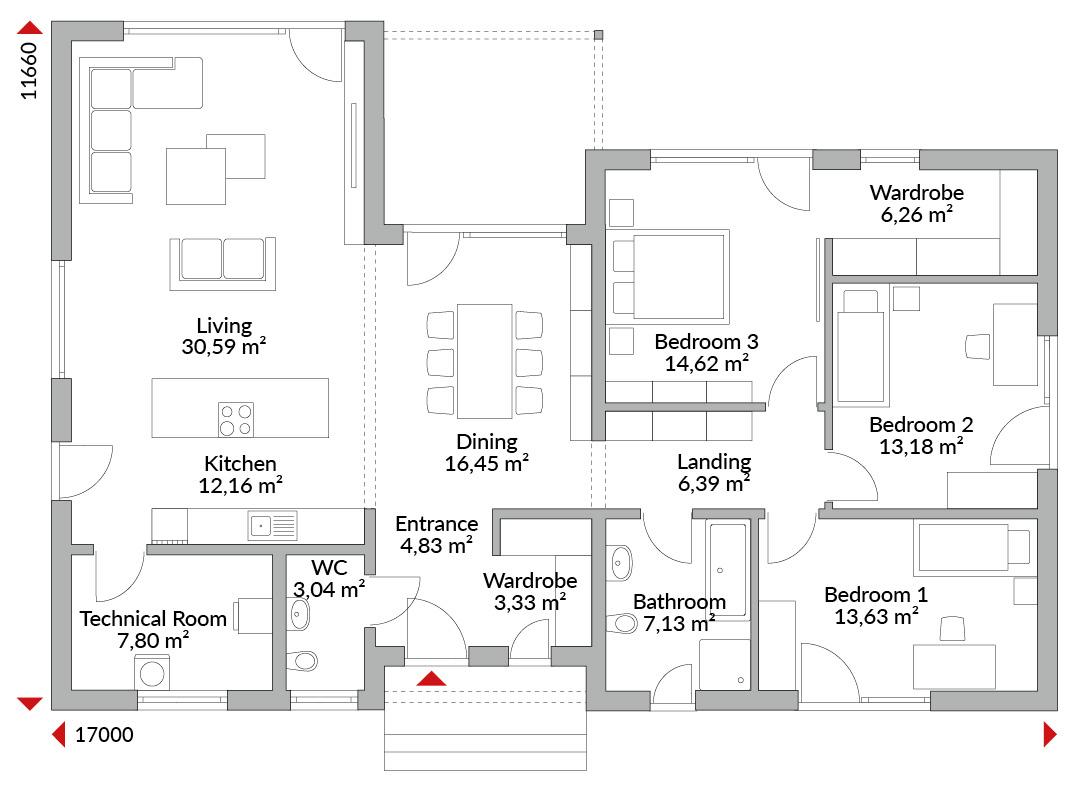 Three-bedroom bungalow with walk-in wardrobe area, cloakroom, open-plan kitchen, bathroom, guest WC, technical room, entrance area and hallway. Integrated canopy over entrance and terrace. Hipped roof with a 25° pitch.