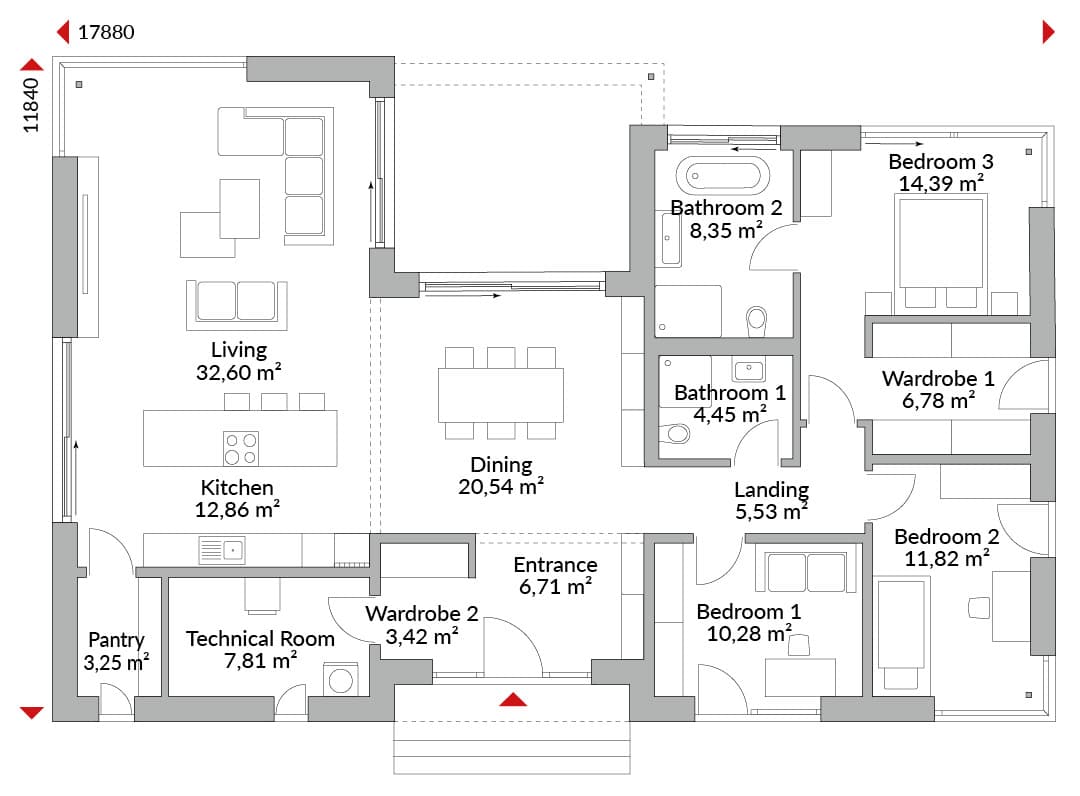 Three-bedroom bungalow with walk-in wardrobe area, cloakroom, open-plan kitchen, pantry, bathroom, guest WC, technical room, entrance area and hallway. Integrated canopy over entrance and terrace. Hipped roof with a 25° pitch.