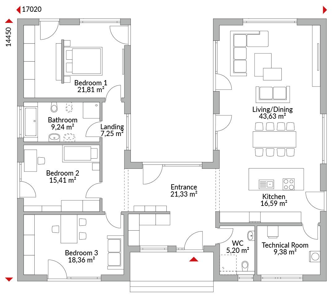 Three-bedroom U-shaped bungalow with cloakroom, open-plan kitchen, bathroom, guest WC, technical room, entrance area and hallway. Integrated entrance canopy. Combination of flat and mono-pitch roof (0°/22° pitch).
