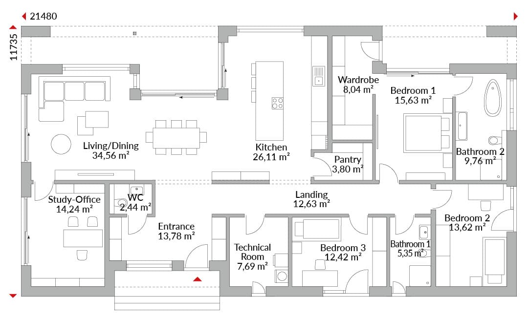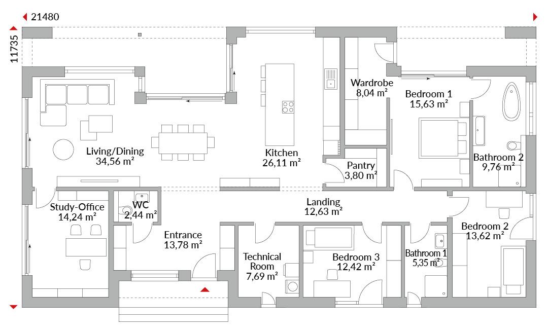 Bungalow with a recessed entrance area to cover the higher front door; terrace in the garden area covered by a roof overhang; the higher ground floor in the dining area with its tall windows is designed as an open-plan kitchen/pantry/living/dining area with sliding doors to the terrace and garden; separate studio for guests or as a home office; three bedrooms, including a master bathroom with en-suite bathroom and walk-in wardrobe area; all bedrooms have access to the outside; additional shower room and guest WC; technical room; hall and hallway.