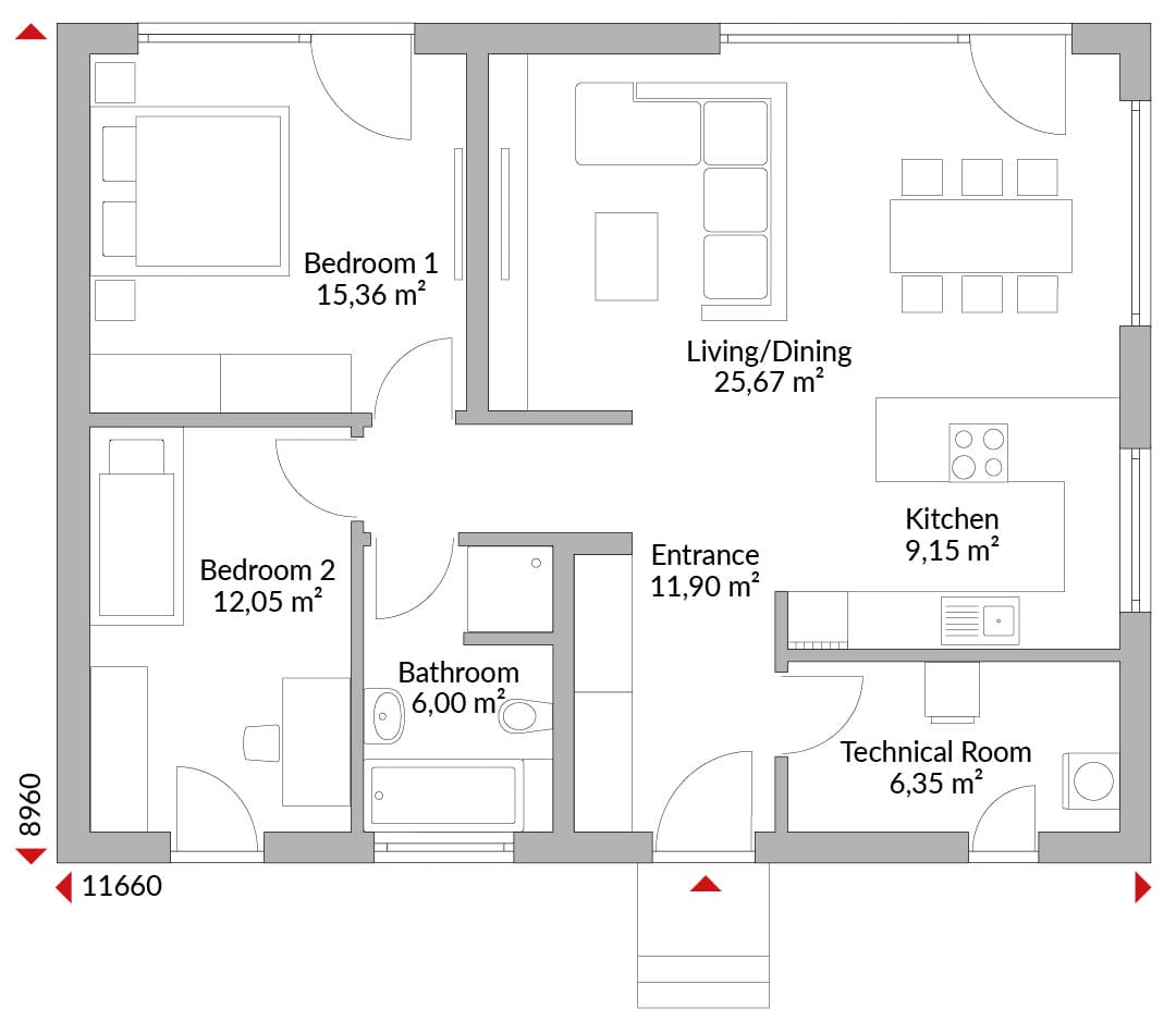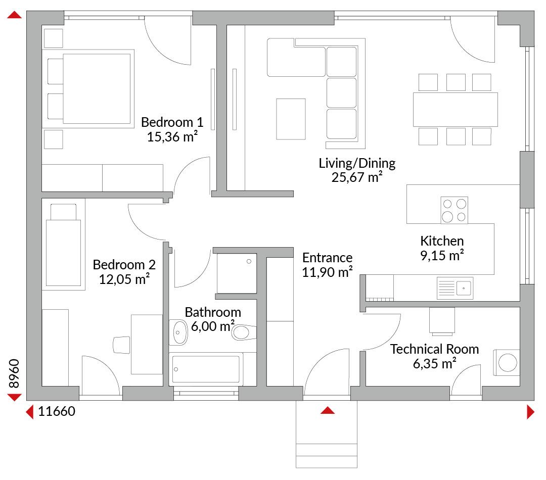 Two-bedroom bungalow, entrance, open-plan living/dining/kitchen area, bathroom with shower, technical room, gabled roof with 22° roof pitch.