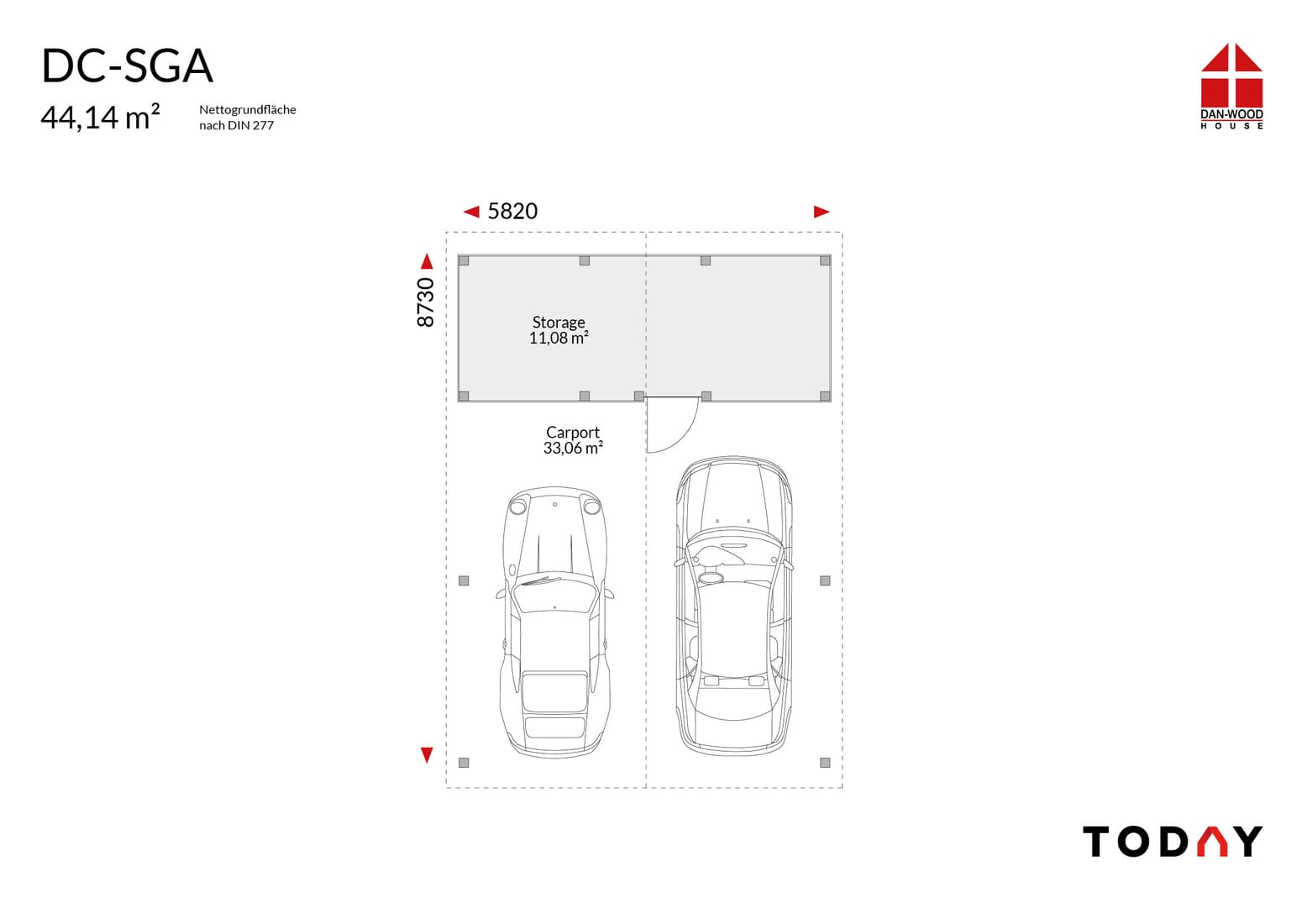 Garage 42.92 m² – Double garage with utility room, gable roof and access to the gable, 6,23m x 8,362m (external dimensions).