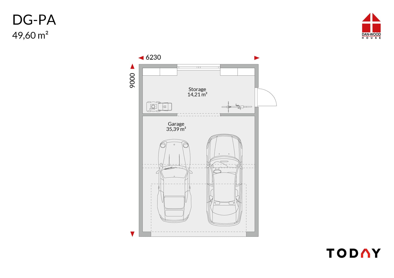 Double garage with mono-pitched roof and storage room (49,60m²); external dimensions 6.23m x 9.00m.