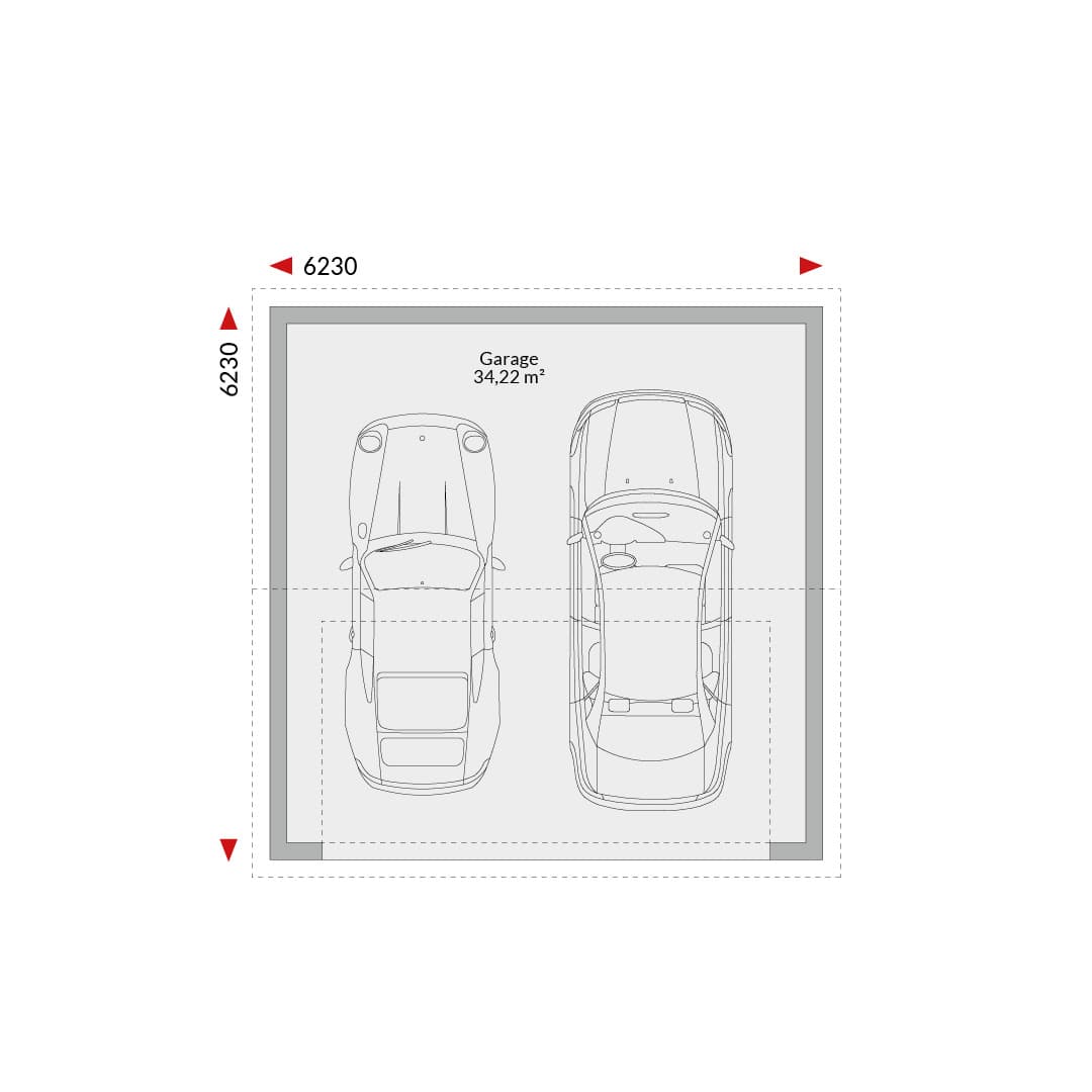 Double garage (34.22m²); gable roof with access to the gable; external dimensions 6.23m x 6.23m.