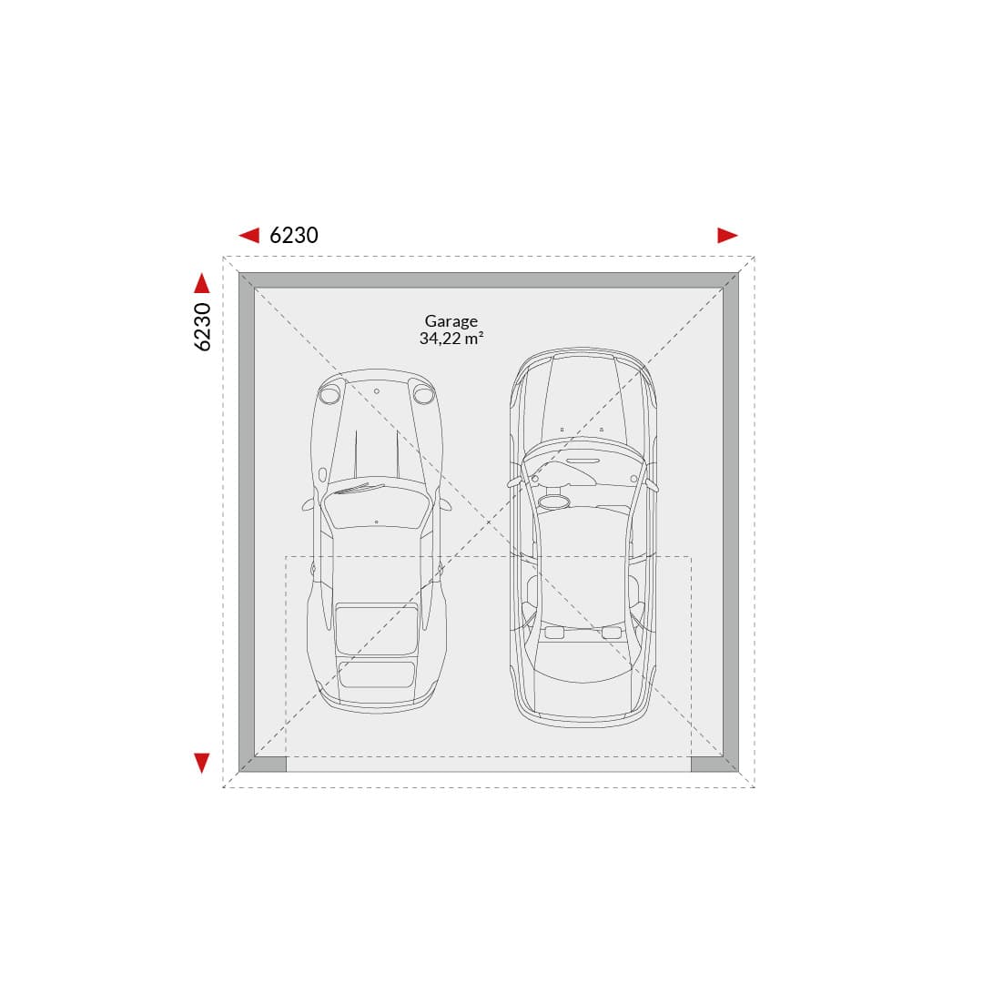 Double garage with hipped roof (34.22m²); external dimensions 6.23m x 6.23m.