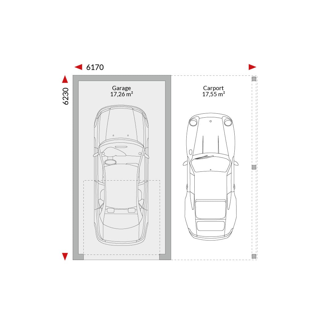 Single garage with car port and flat roof (34.81m²); external dimensions 6.17m x 6.23m.