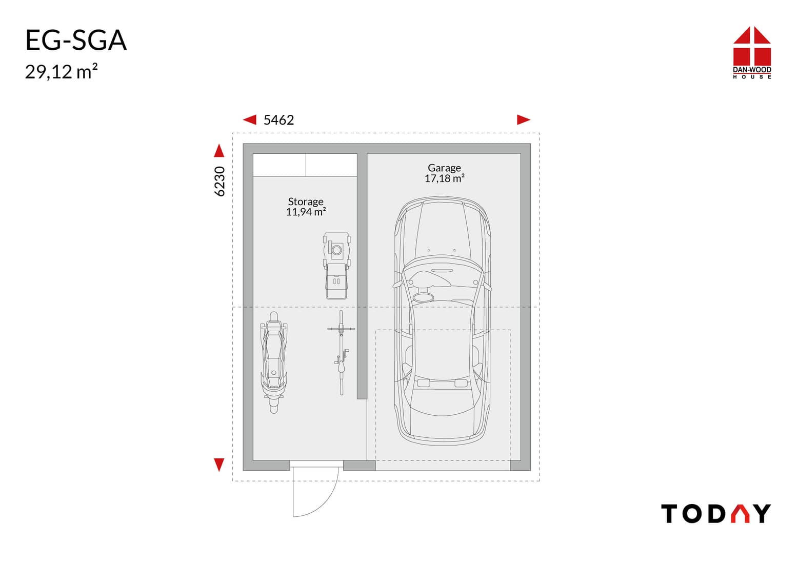 Single garage with utility room (29.12m²); gable roof with access to the gable; external dimensions 5.462m x 6.23m.