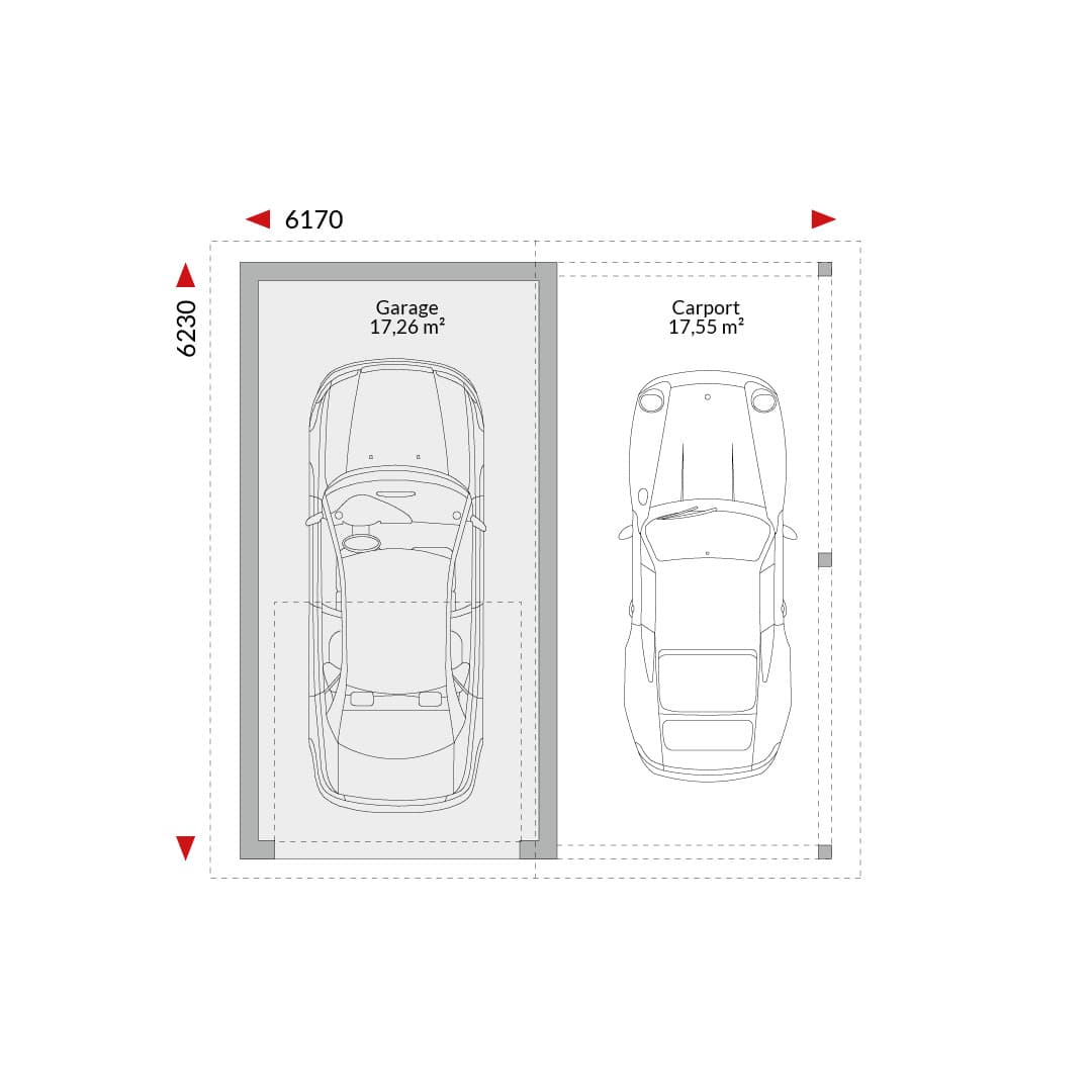 Single garage with carport (34.81m²); gable roof with access to the gable; external dimensions 6.17m x 6.23m.