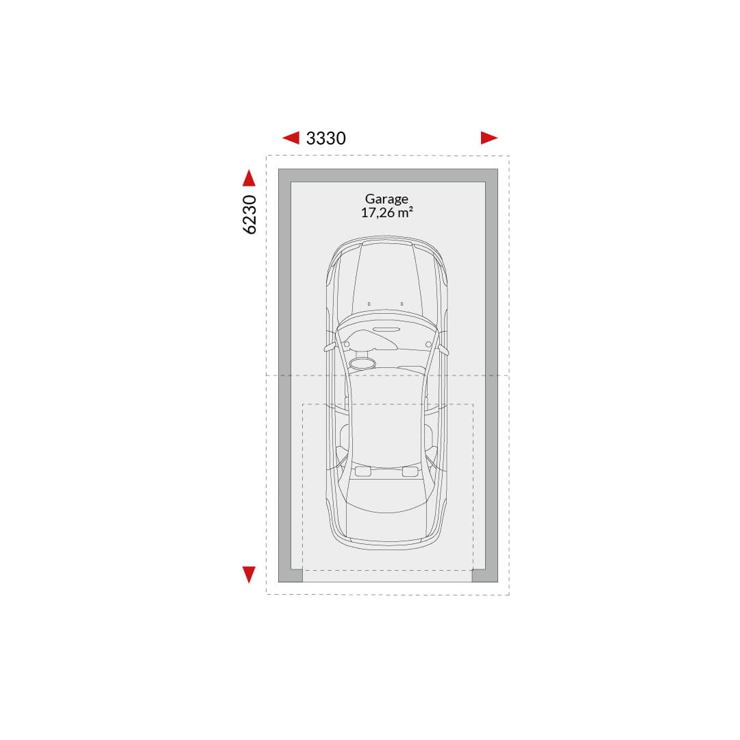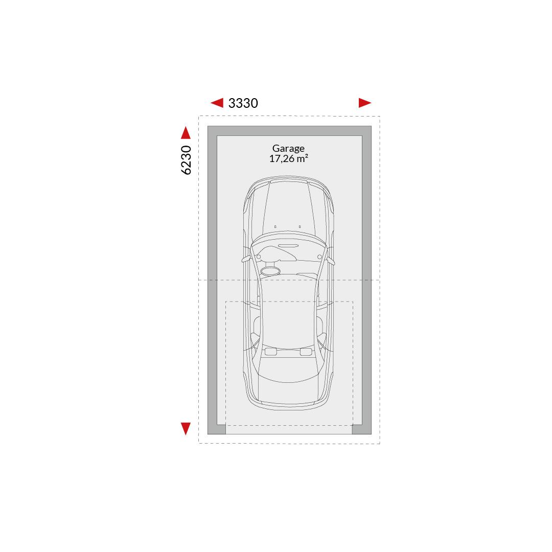 Single garage (17.26m²); gable roof with access to the eaves; external dimensions 3.33m x 6.23m.
