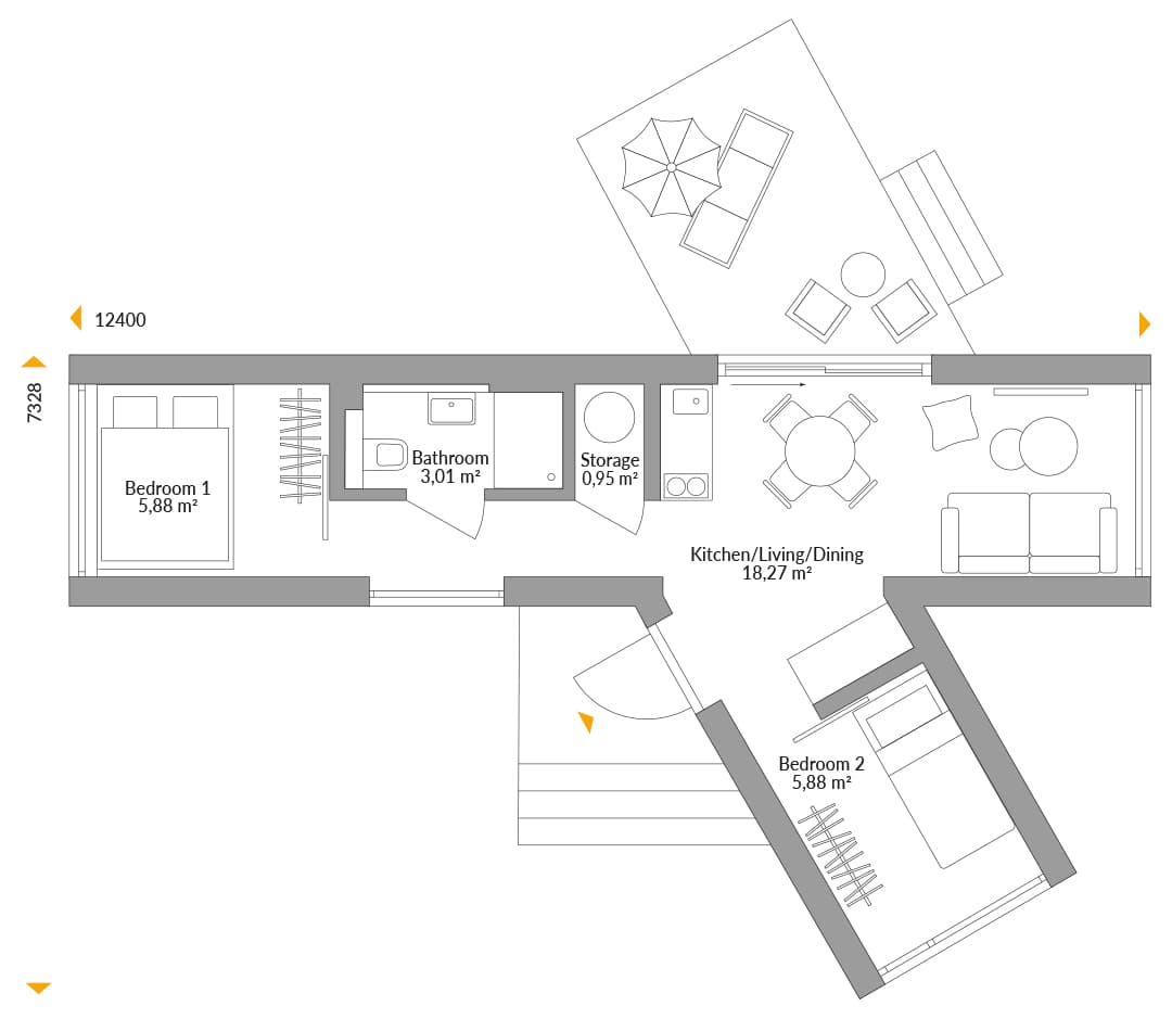 Add more modules: if the plot allows for a slightly wider house – in this case a good 7m – an additional narrow S-module can make your holiday home even more comfortable. Another smaller bedroom and an inviting entrance area are gained by adding a side wing, adding an extra 11sqm of living space, compared to the NEXT Holiday 23 S-1 E. Panoramic glass walls create the feeling of sitting in the middle of the great outdoors!