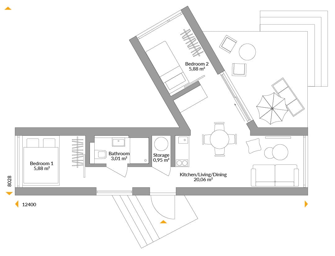 Narrowly spacious: this elegant NEXT Holiday home with its natural-coloured slated cladding is almost 36sqm. It’s constructed using narrow S-modules but there is still space for a second bedroom thanks to the additional docked wing which also increases space for family gatherings in the living area between the two modules. The large, glazed windows offer wonderful views in all four directions, while a sheltered terrace provides additional outdoor living space.