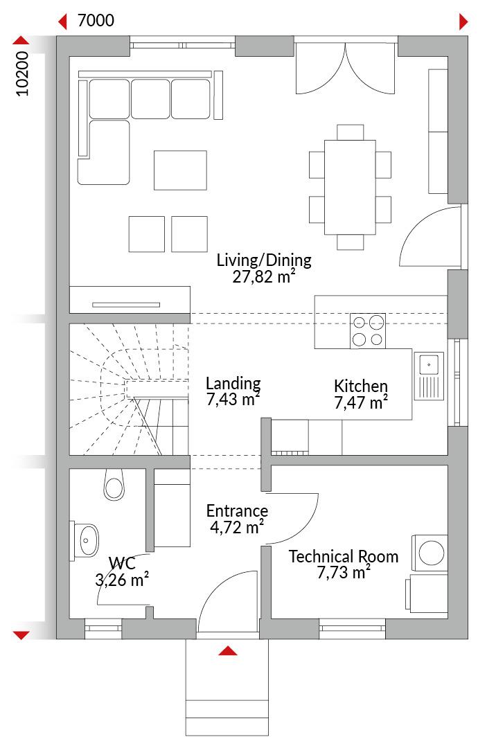 Two-storey semi-detached house with four bedrooms, walk-in wardrobe area, kitchen, bathroom, guest WC, technical room and entrance hall. Hipped roof with 22° pitch.