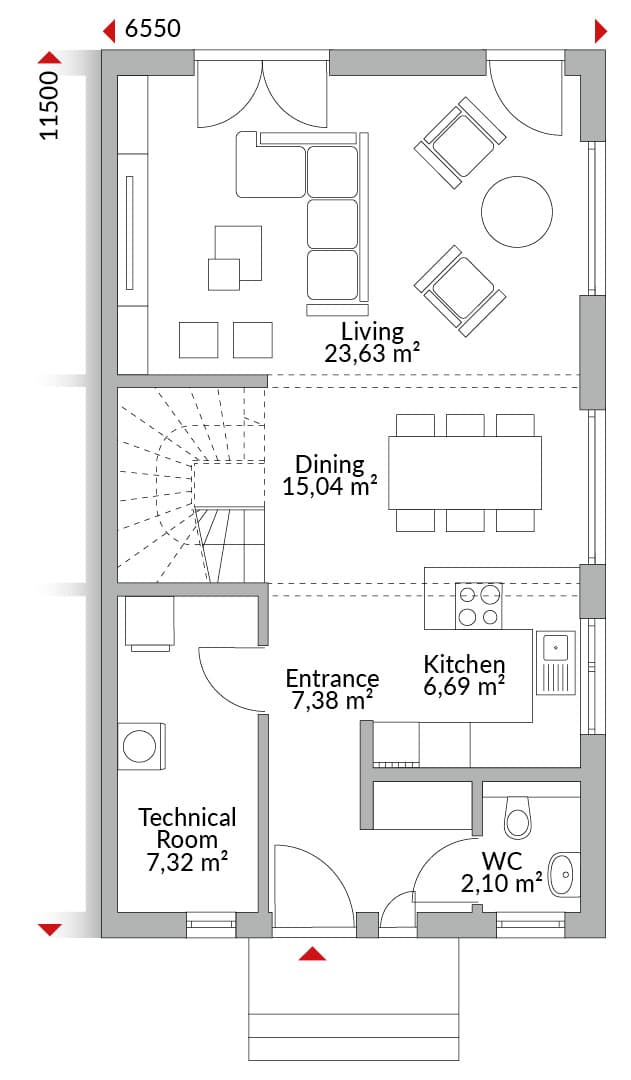 One-and-a-half-storey semi-detached house with four bedrooms, walk-in wardrobe area, kitchen, bathroom, guest WC, technical room, storage room and entrance hall. Gabled roof with 40° pitch. Knee wall height: 1.25 m. Extended roof as terrace canopy.