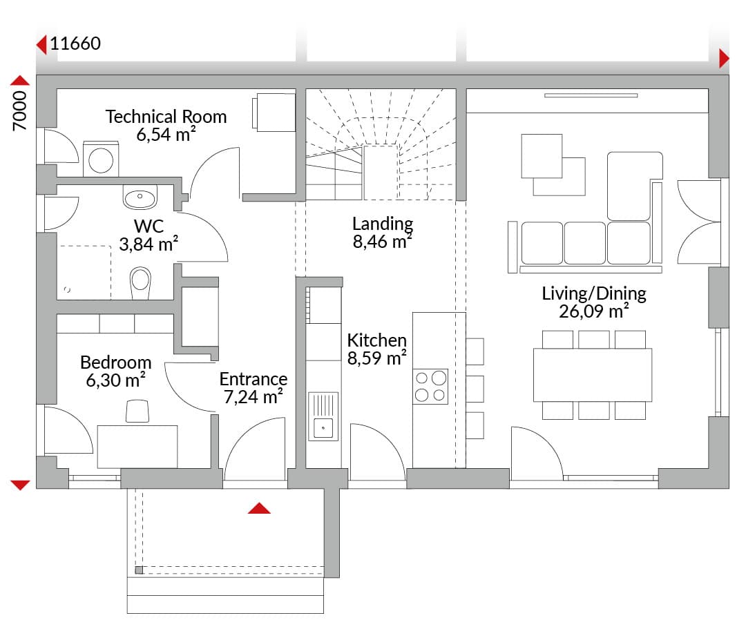 Semi-detached house with five bedrooms, walk-in wardrobe area, kitchen, bathroom, guest WC, technical room and entrance hall. Integrated flat-roof entrance canopy with side wall. Gabled roof with 25° pitch. Knee wall height: 1.75 m. Dormer with flat roof.
