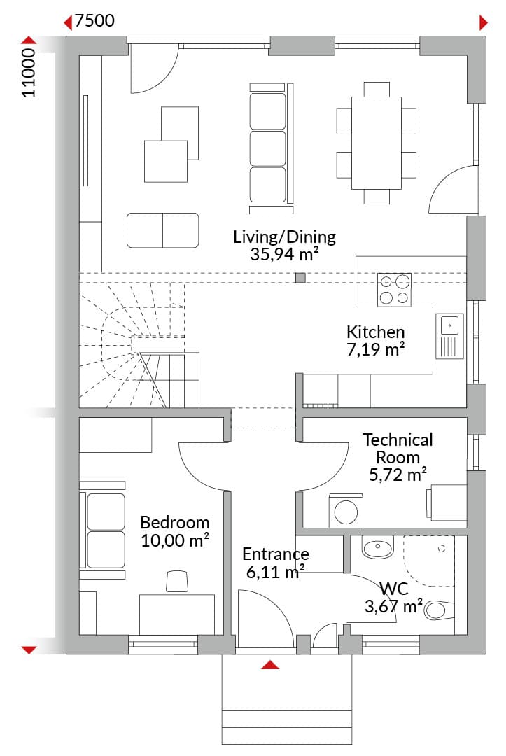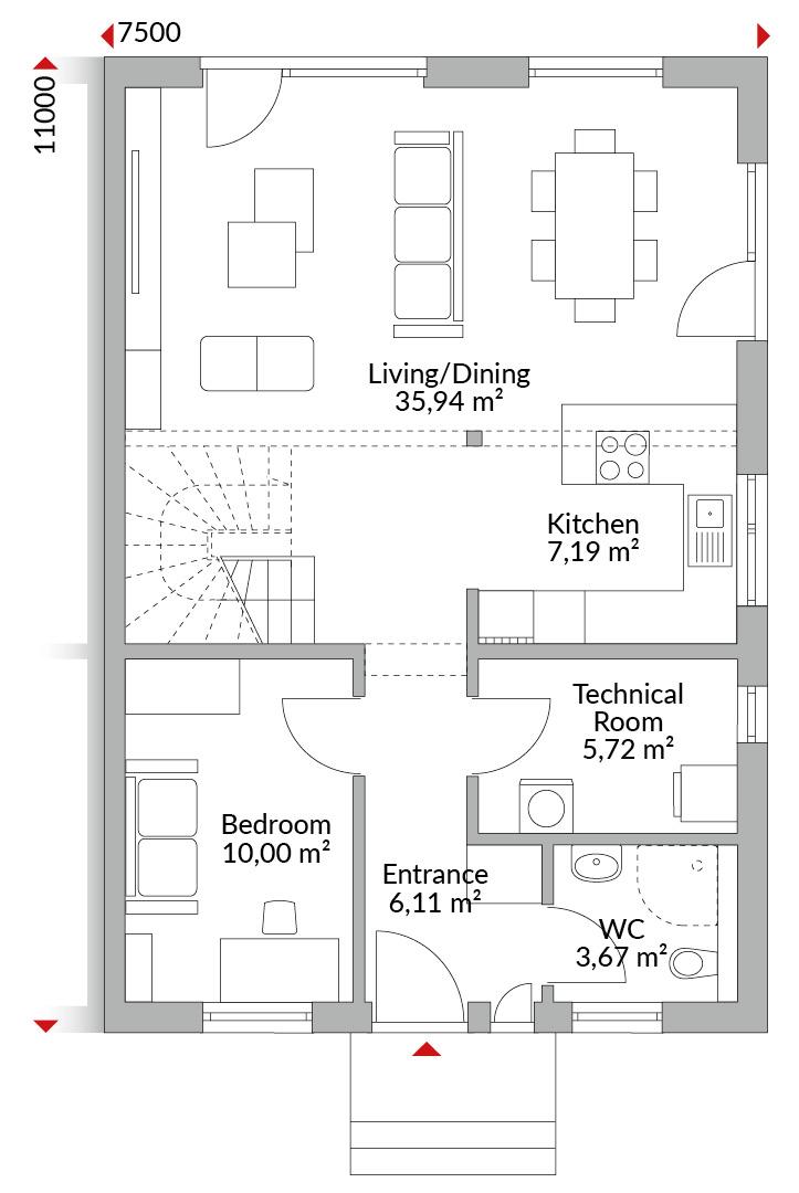 One-and-a-half-storey semi-detached house with five bedrooms, kitchen, bathroom, guest WC, technical room and entrance hall. Gabled roof with 40° pitch. Knee wall height: 1.00 m. Dormer with gabled roof.