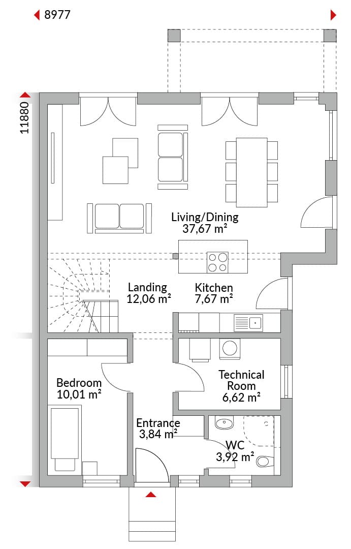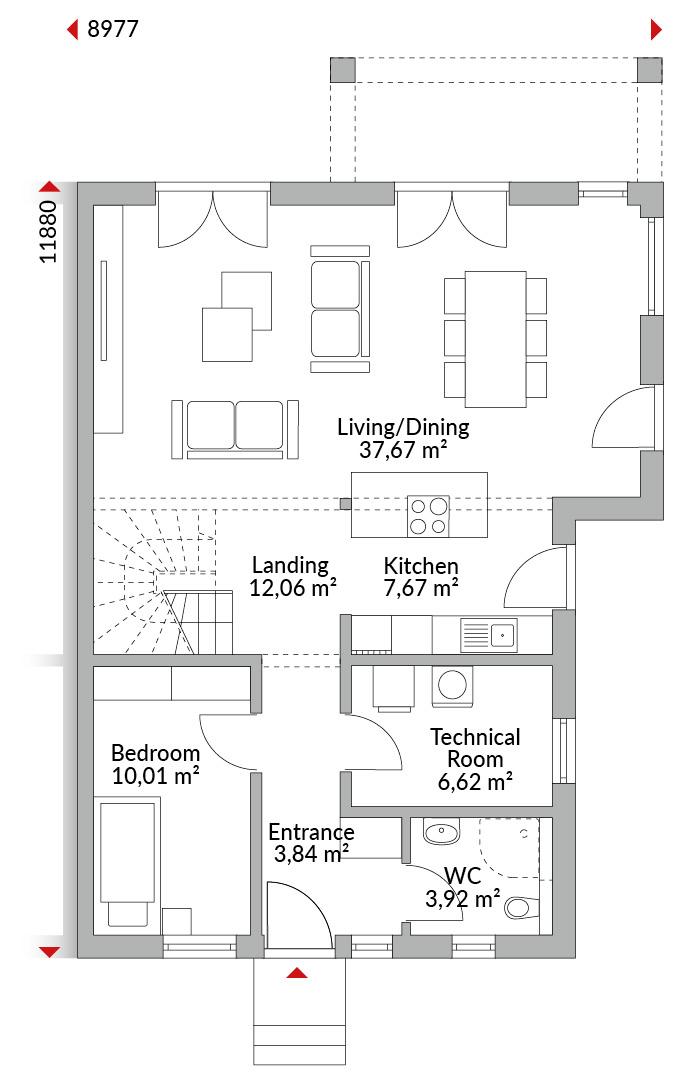 Two-storey semi-detached house with six bedrooms, walk-in wardrobe area, kitchen, bathroom, guest WC, technical room and entrance hall. Hipped roof with 22° pitch. Integrated terrace canopy with flat roof.